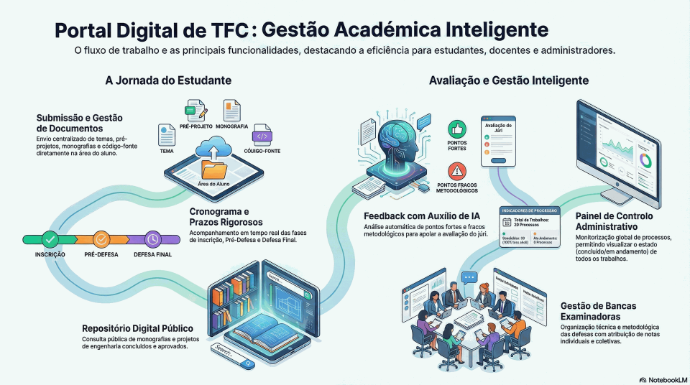 O portal é uma plataforma dedicada à Gestão Inteligente de Trabalhos de Fim de Curso (TFC) e Auditoria Académica Ativa. O sistema centraliza todo o fluxo dos projetos finais e está dividido em módulos específicos para cada tipo de utilizador: